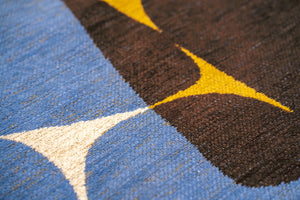 Gallery Stones Sunny Blue 2085 ist lebendig, grafisch und selbstbewusst. Organische Formen überlagern sich wie ausgeschnittene Elemente einer Collage. Sonniges Gelb, tiefes Braun und klares Blau sorgen für Spannung und Bewegung. Dieser Teppich setzt Akzente und verleiht dem Raum sofort Charakter.