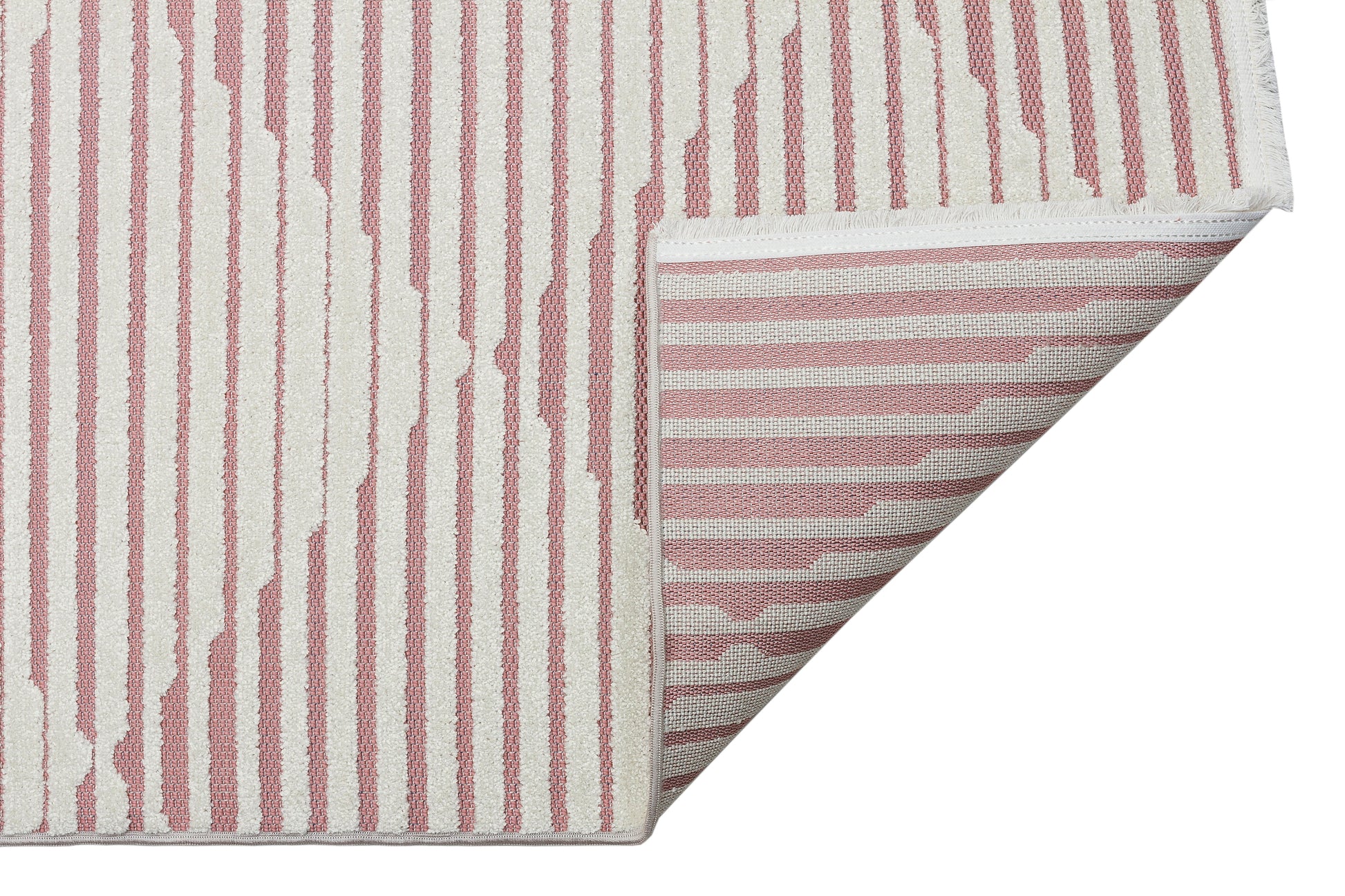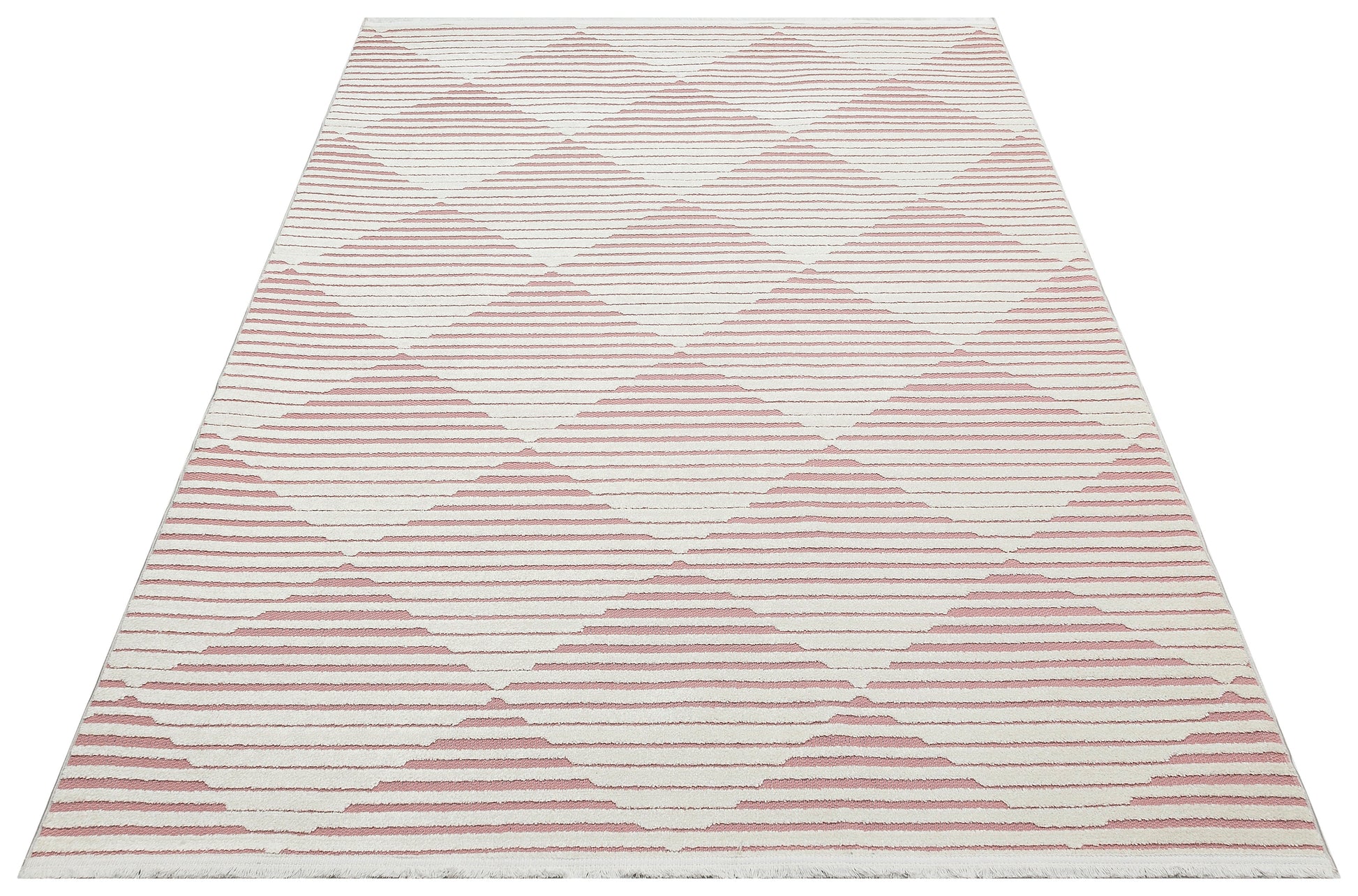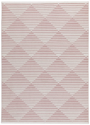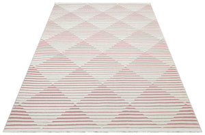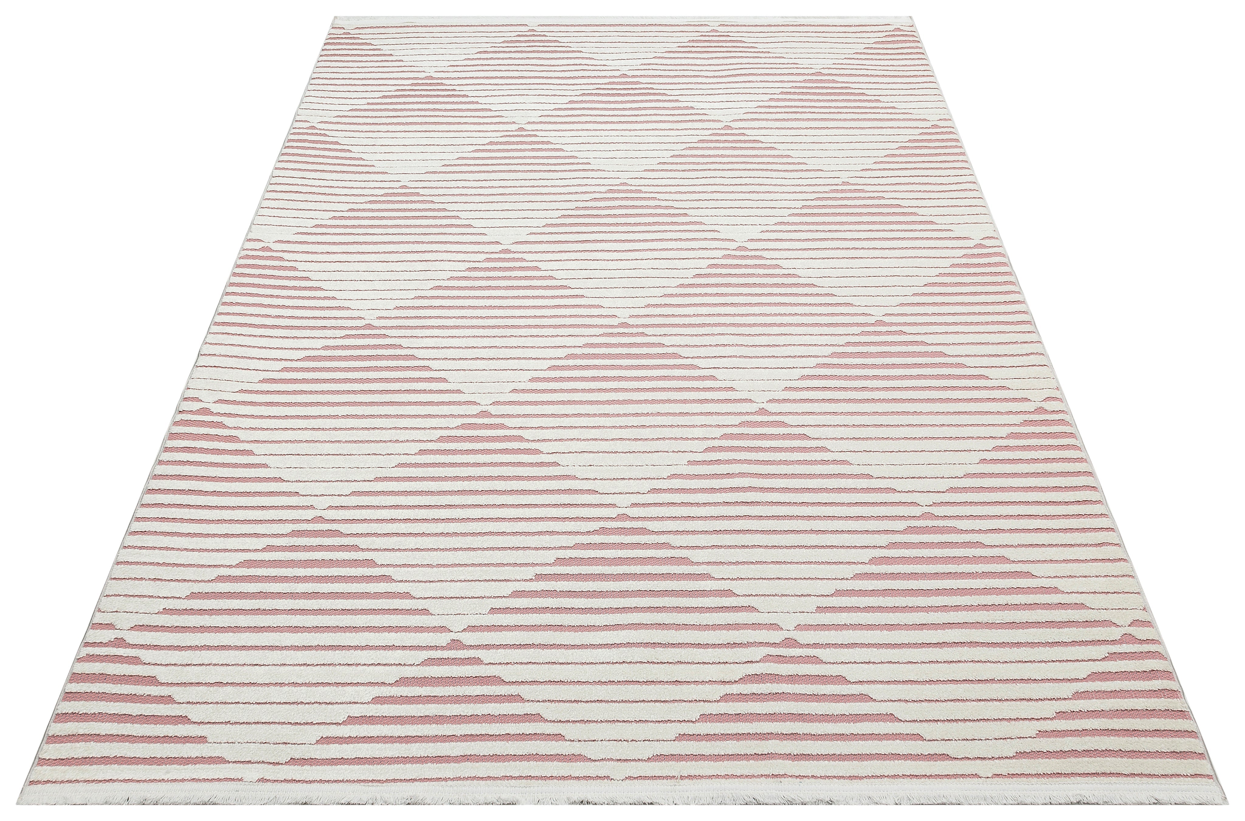 Stel je voor dat je op een zacht, geweven oppervlak stapt dat niet alleen luxueus aanvoelt onder de voeten, maar ook een vleugje kleur toevoegt met zijn prachtige roze en ivoorkleurige tinten. Het geometrische patroon brengt een moderne touch, waardoor je decor wordt verheven en een gezellige sfeer ontstaat.