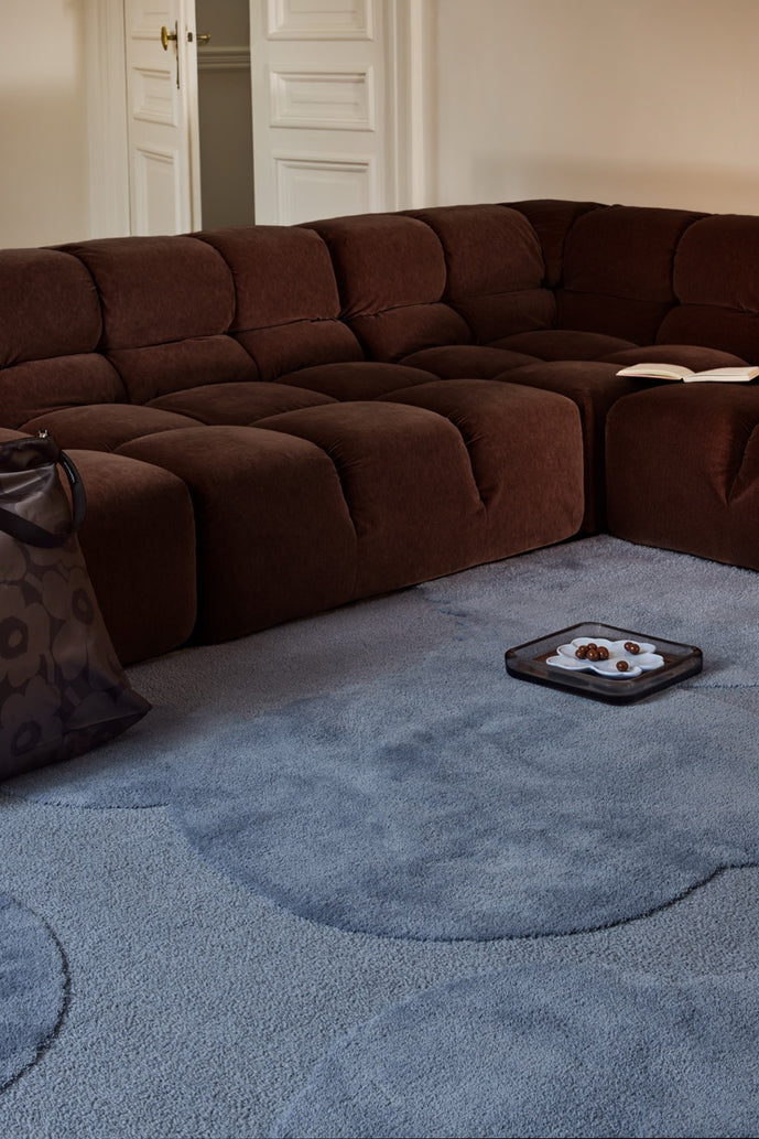 Pair this rug with clean-lined furniture, light woods and muted textiles to enhance its Nordic character. It also works beautifully as a contrast in interiors with darker furniture, where the dusty blue tones soften the overall look.