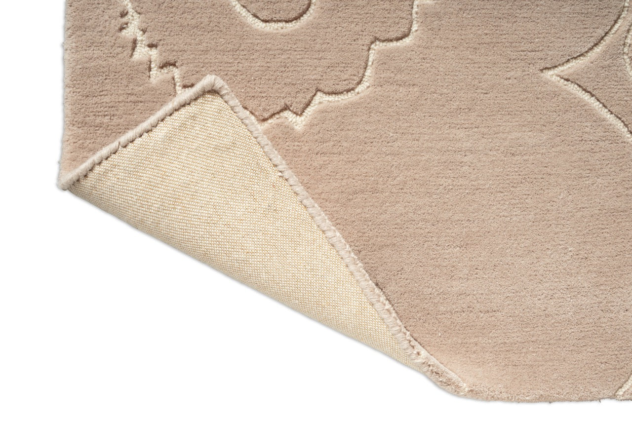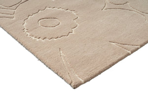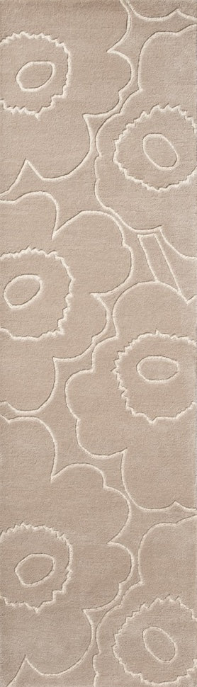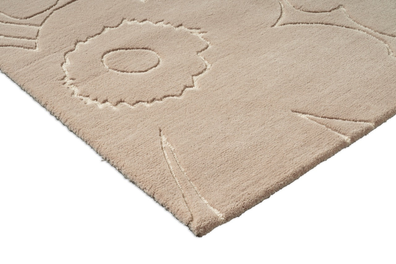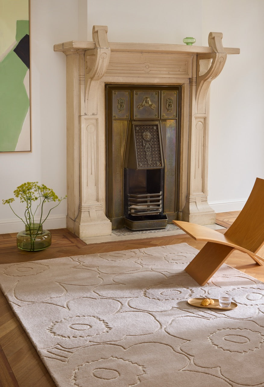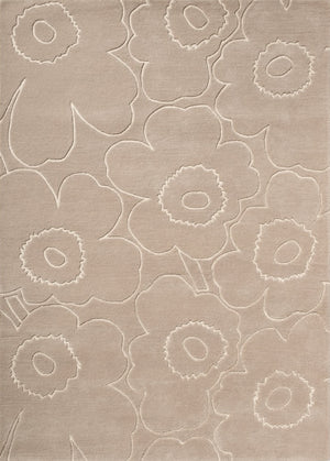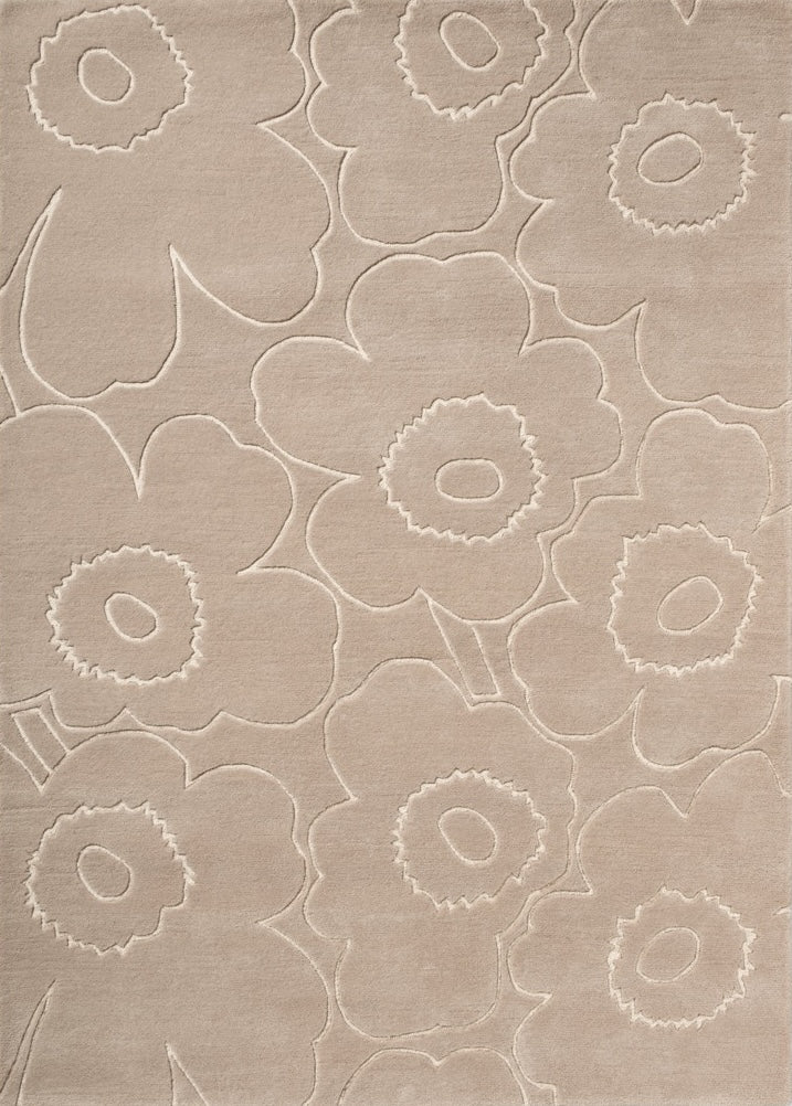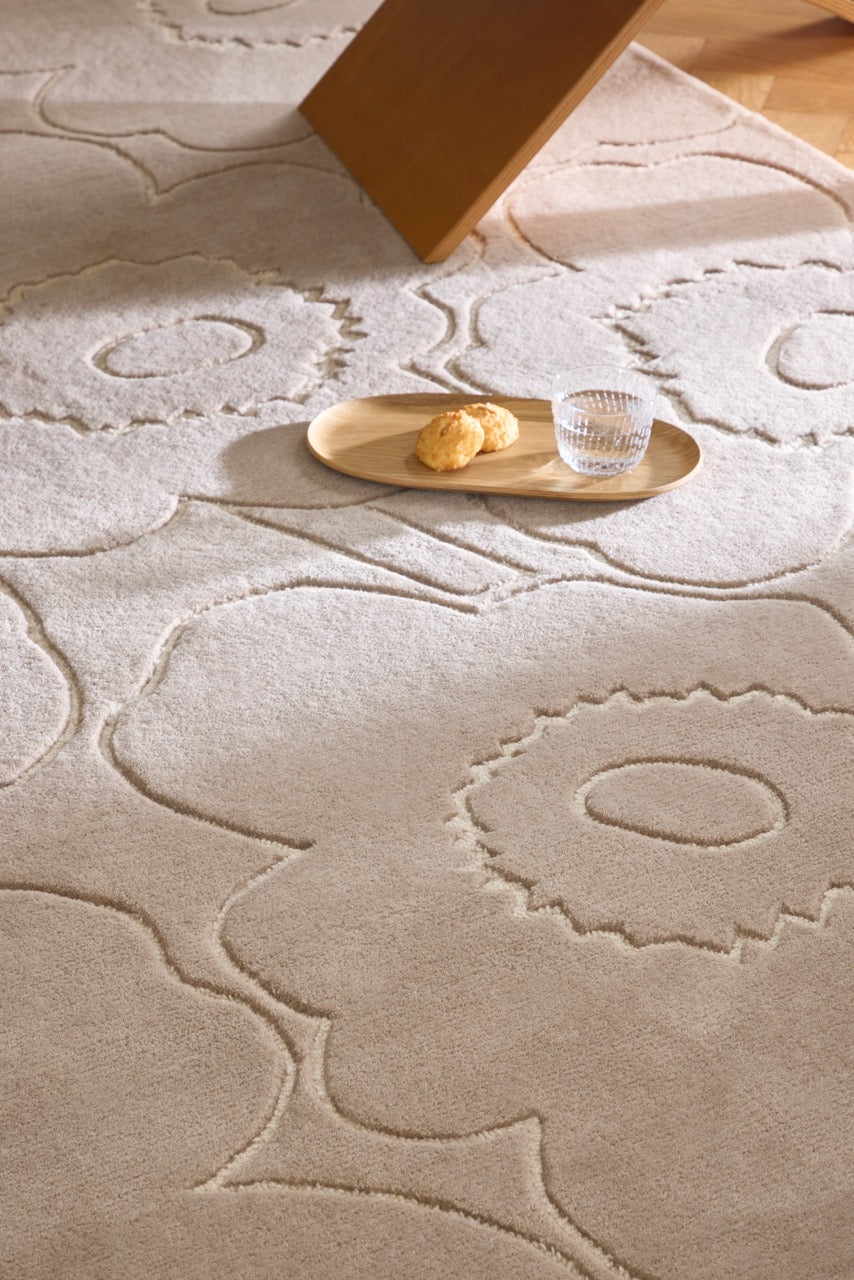 The Marimekko Piirto Unikko Greige rug translates the iconic Unikko flower into a softer, warmer expression. The greige tone sits perfectly between beige and grey, giving the design a grounded, understated character while allowing the sculpted floral outlines to remain clearly visible.