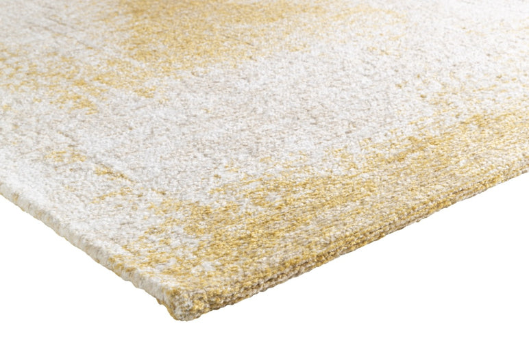 Sa structure en chenille, composée d’un mélange raffiné de coton et de polyester, offre une surface veloutée aux reflets mats. Les nuances d’ivoire et de sable doré se fondent avec délicatesse, évoquant la brillance du soleil sur la terre. Ce tapis semble respirer la quiétude, comme un horizon immobile au cœur de la maison.