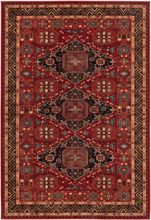 Le modèle Kazak Kashqai 4308.300 présente un design saisissant avec trois médaillons centraux, inspirés des tapis caucasiens traditionnels. Son allure majestueuse crée un point focal dans tout intérieur.