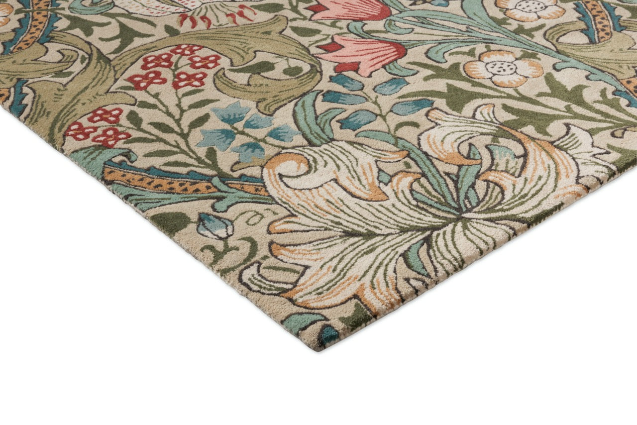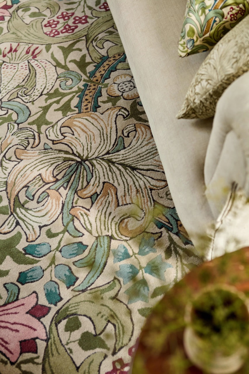 Transformeer je interieur met het iconische Golden Lily vloerkleed van Morris & Co. Dit prachtige design toont William Morris' befaamde bloemenmotief in rijke groene en rode tinten, en brengt de schoonheid van de natuur en de erfenis van de Arts & Crafts-beweging in je huis.