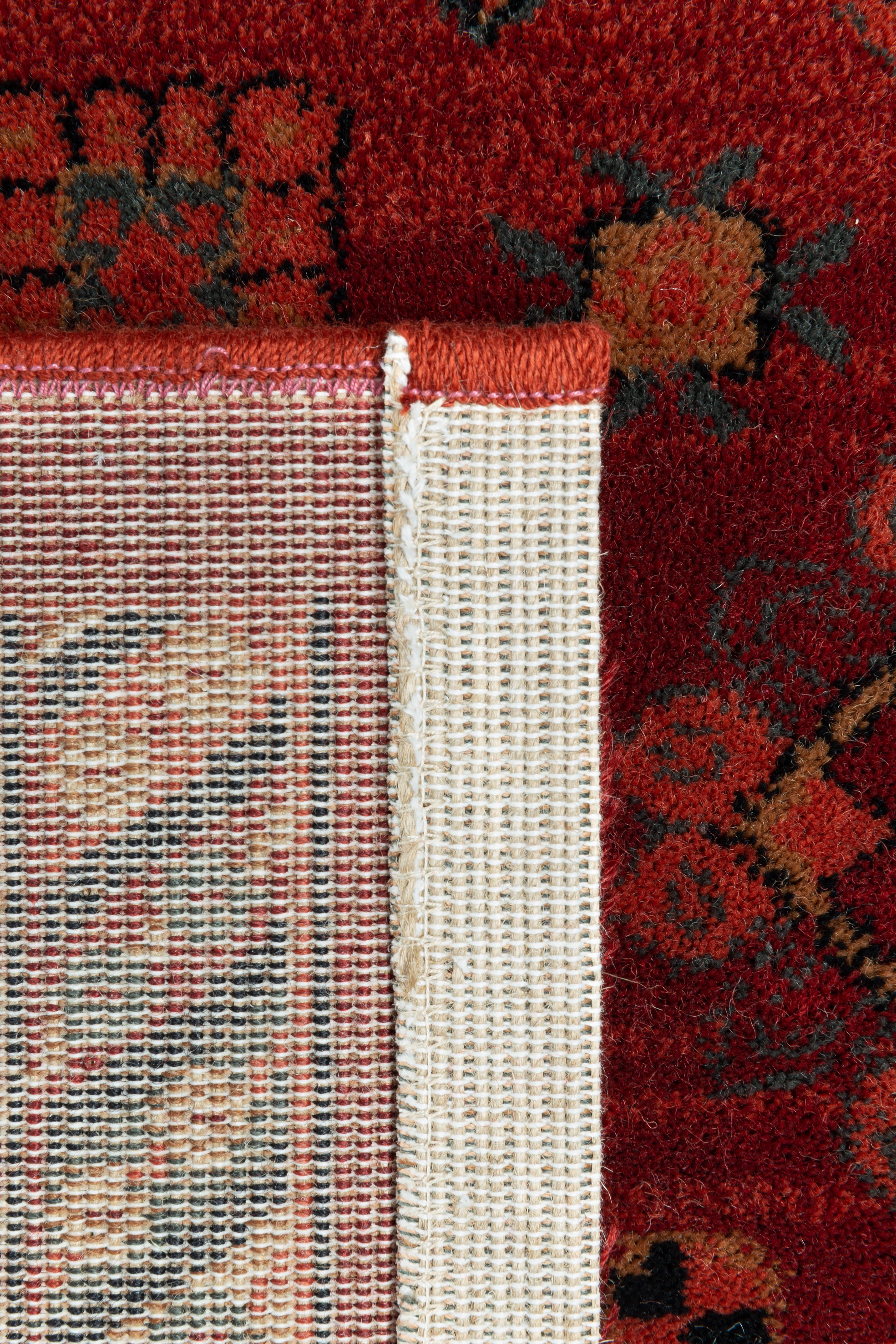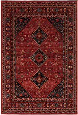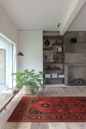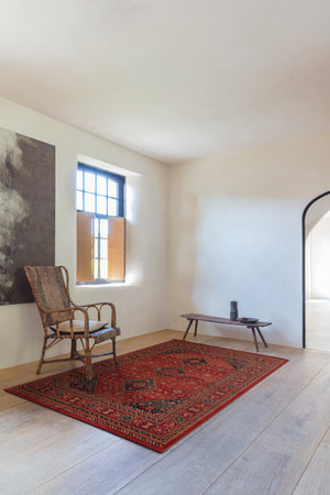 Het rijke donkerrood vormt een krachtige basis, terwijl het centrale medaillon de aandacht trekt en een sterk middelpunt in de ruimte creëert. Geometrische accenten en verfijnde details geven het tapijt diepte en karakter. Het resultaat is een vloerkleed dat zowel in klassieke als moderne interieurs tot zijn recht komt en altijd een vleugje authenticiteit toevoegt.
